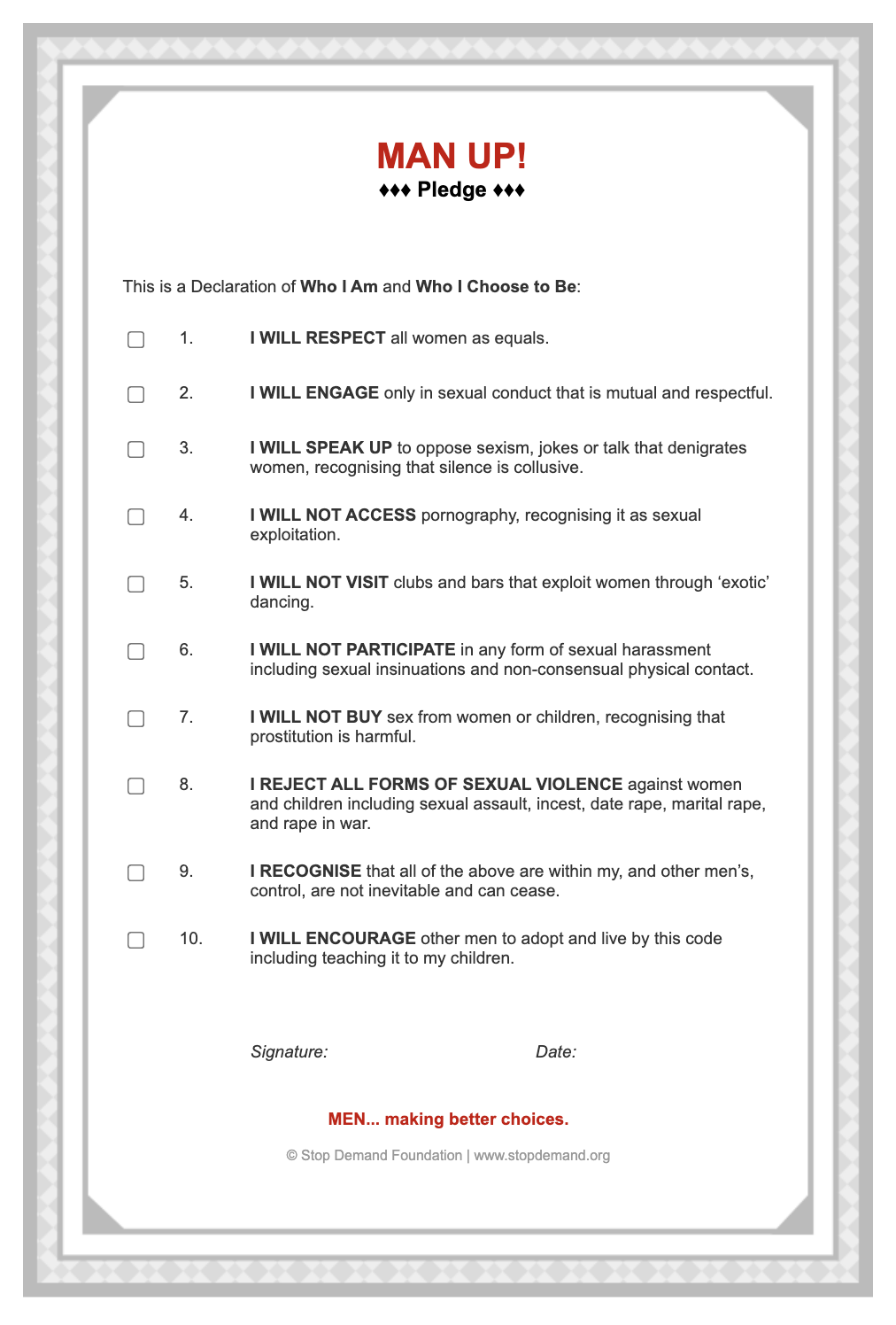 - Significant men in your life - friends, brothers, sons, father, relatives, colleagues, boss/es. Encourage your workplace and your local men's groups to adopt the Man Up! Pledge for Men's Groups & Corporates